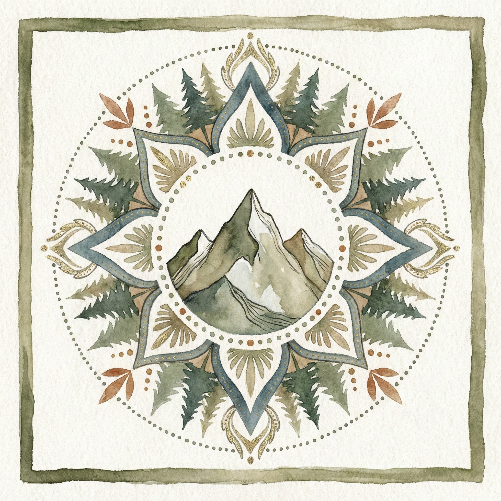 This decorative watercolor painting frames a mountain vignette inside a mandala-style medallion, creating a calm, folk-inspired mood. Translucent washes and soft gradients model the central peaks, while crisp ink-like outlines and dotted detailing bring graphic clarity to the geometry. Layered evergreen silhouettes radiate outward in muted sage and deep pine, balanced by warm ochre accents and a hand-painted border. The composition reads serene and refined on the wall.